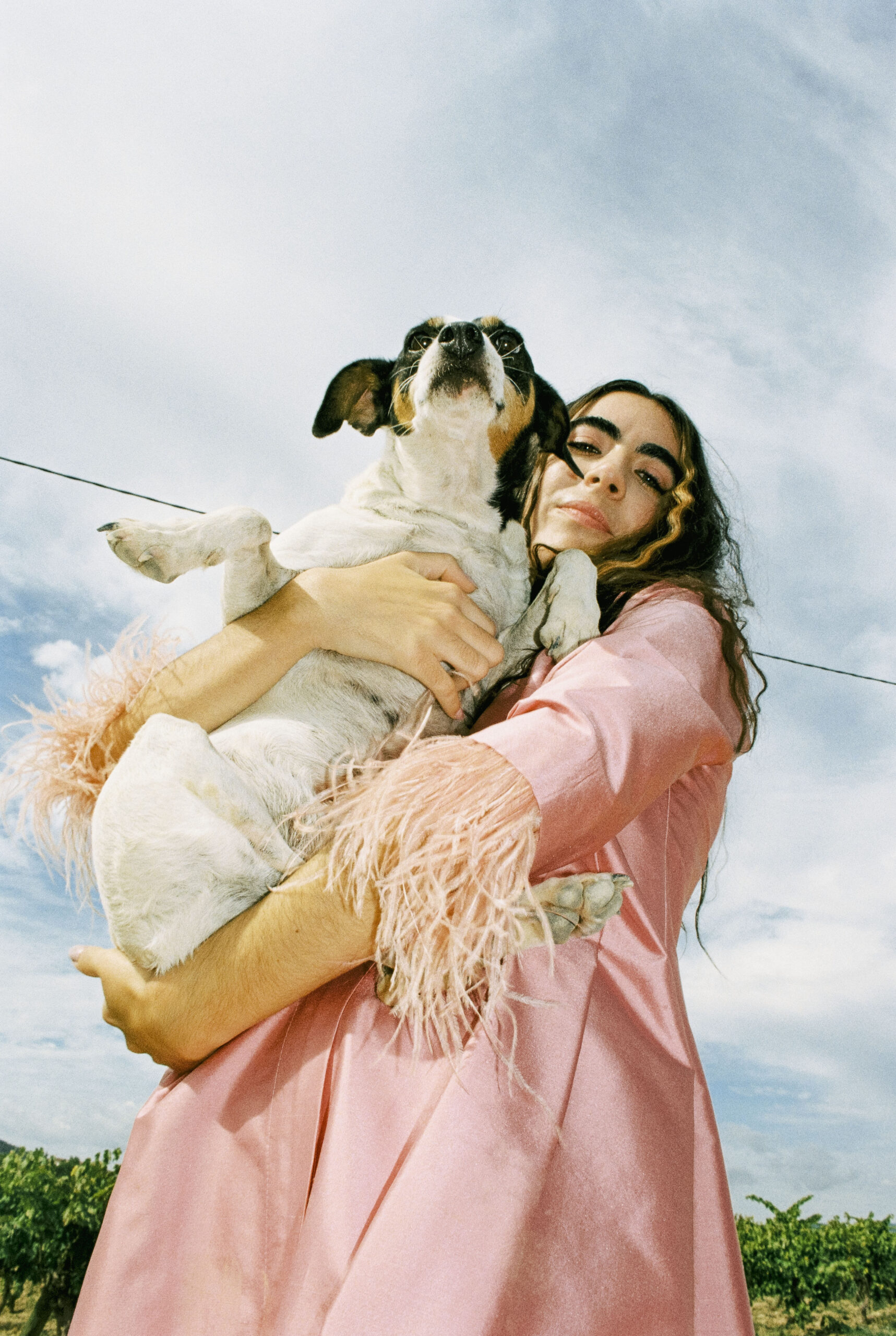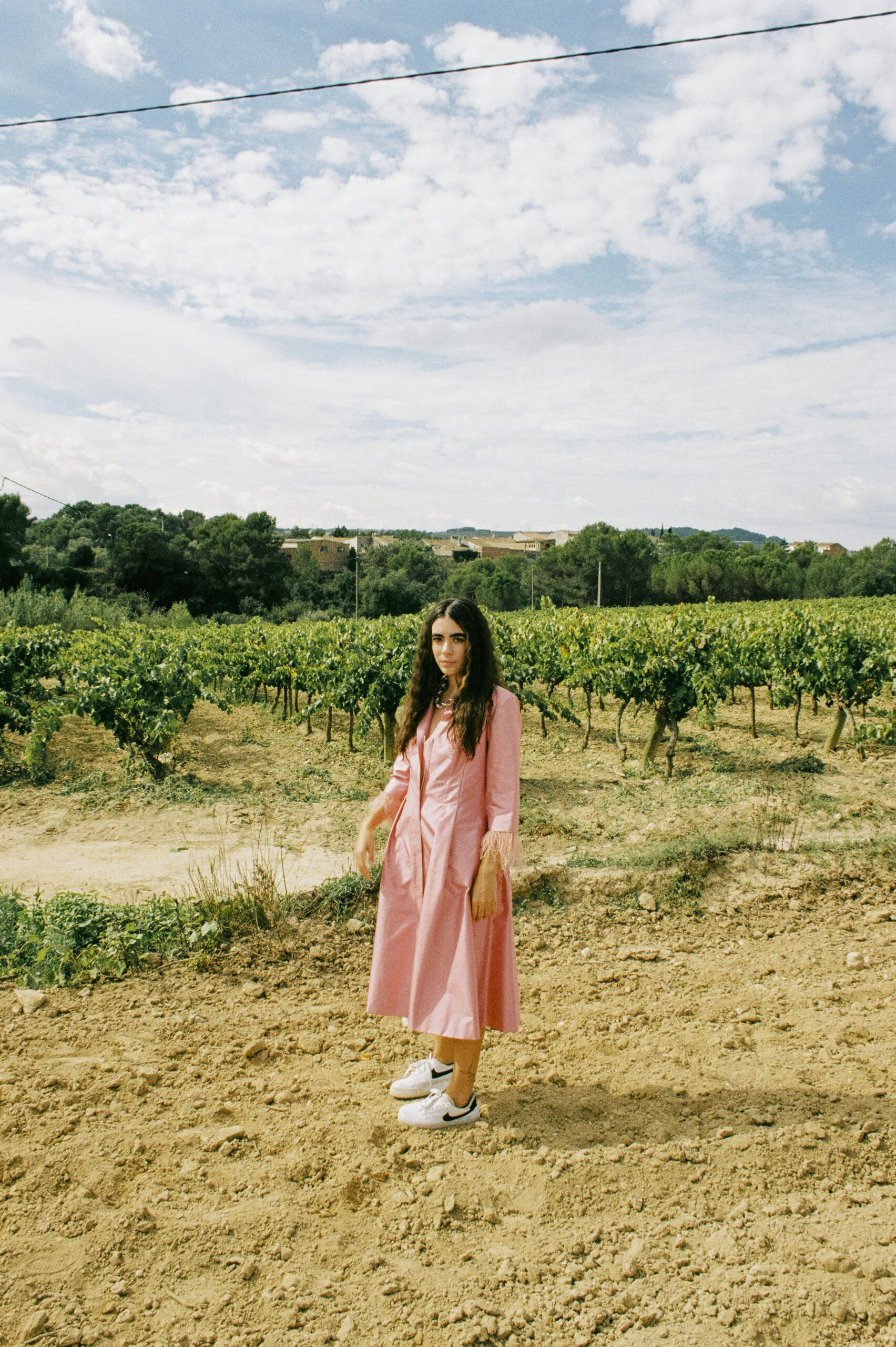 Las prendas que podéis ver en esta editorial, pertenecen al stock que Anna Garcia guarda en su casa, en un pequeño taller donde sí tuve la oportunidad de ir y aprender un poco más de cómo trata el sector a las modistas, a su trabajo que antes parecía casi imprescindible y que hoy en día ya está prácticamente obsoleto, sobretodo para las generaciones más jóvenes. Nos contaba sobre el mini vestido rosa palo de tiras, «lo hice hace años para un evento al que tenía que ir mi hija,también le hice el vestido de la comunión e incluso el de su boda». De su última colección, de la cual aún quedan muchos modelos, nos rompió escuchar «cuando cerré la tienda en Balmes, tuve que tirar muchísimas prendas porque no tenía espacio para guardarlas « . El vestido satinado rosa con plumas en los extremos de las mangas es uno de los diseños que aún guarda. Lo que hacen especiales este tipo de prendas, es el amor con el que están hechas, mentiría si dijera que el exterior era más bonito que el interior, porque cada detalle era perfecto, no se veía ningún error. Aún tenía una gran cantidad de tejidos esperando ser usados «estos tejidos són preciosos, los encargaba en las mejores distribuidoras de Barcelona e invertía mucho dinero en ellos » a lo que yo respondía con cara de admiración, observando embelesada las decenas de telas de todos los colores. La falda púrpura, se trata de un moulage, idea que junto a Anna desarrollamos en su salón sobre el maniquí, con el objetivo de aportar algo distinto, surgió la idea de dar la vuelta al urdido del tejido creando un precioso efecto con volumen gracias a la forma en la que caen las plumas.